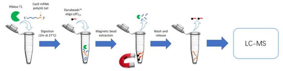 本项目利用液相色谱-质谱联用(LC-MS)方法对 mRNA 样品的 poly-A 尾长度 进行分析(Beverly et al., 2018)。样品首先经过 RNase T1 酶切处理,再利用 oligo dT25 磁珠对酶切产生的 poly-A 尾片段进行纯化富集。制备好的 poly-A 尾样品 利用 LC-MS 进行分析,得到的结果经去卷积处理确定 poly-A 尾长度及相对丰度。